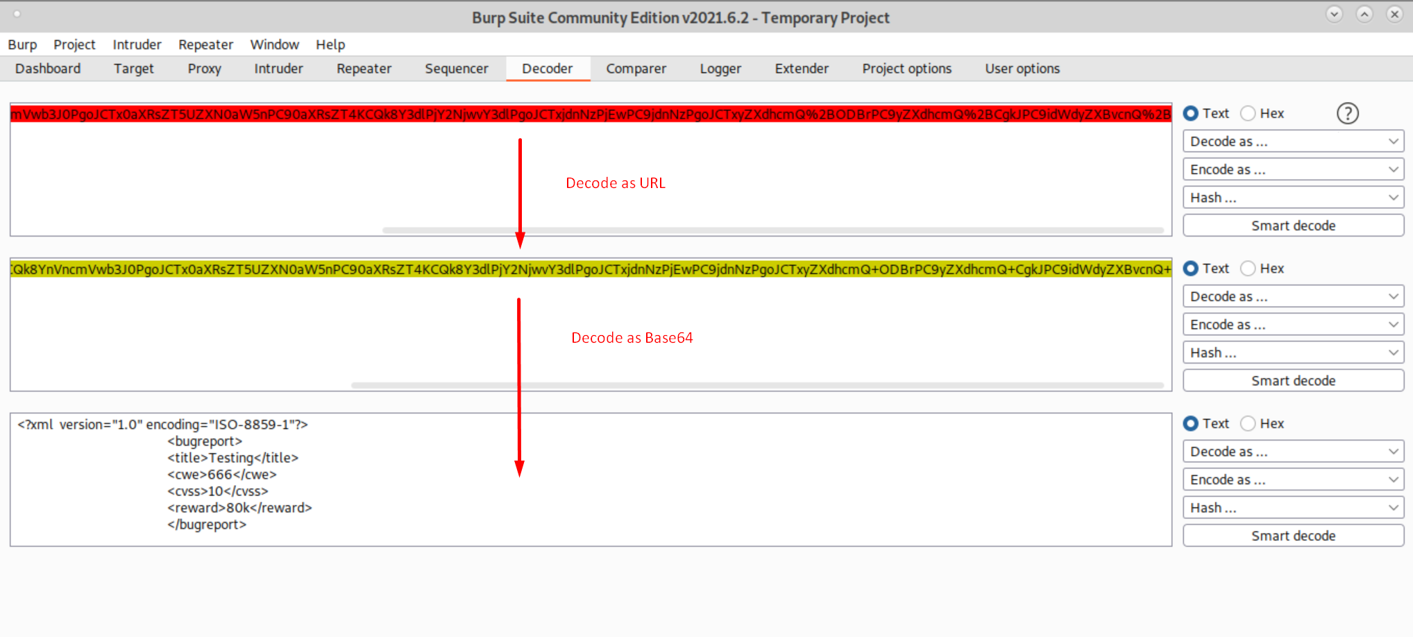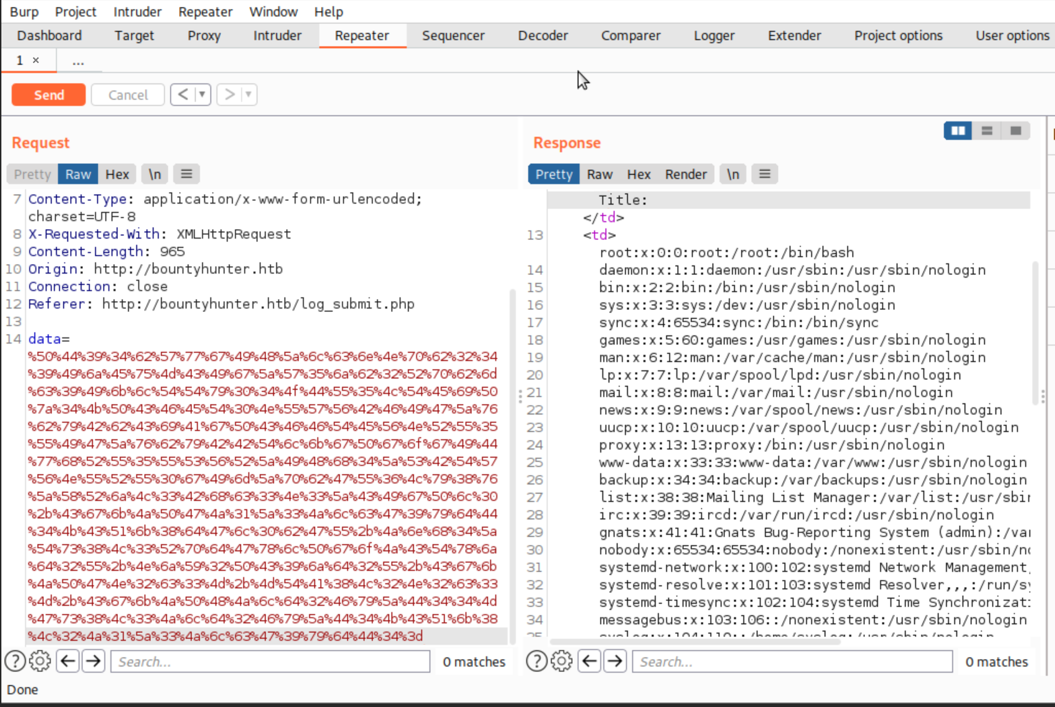 Enviamos todo a Repeater para trabajar con comodidad y nos llevamos el resultado de data a Decoder , para analizar y generar el payload que vamos a inyectar