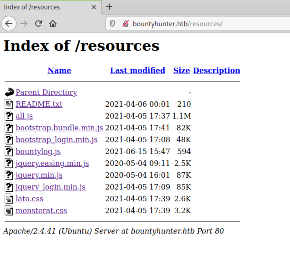 http://bountyhunter.htb [200 OK] Apache[2.4.41], Country[RESERVED][ZZ], HTML5, HTTPServer[Ubuntu Linux][Apache/2.4.41 (Ubuntu)], IP[10.129.192.240], JQuery, Script, Title[Bounty Hunters]