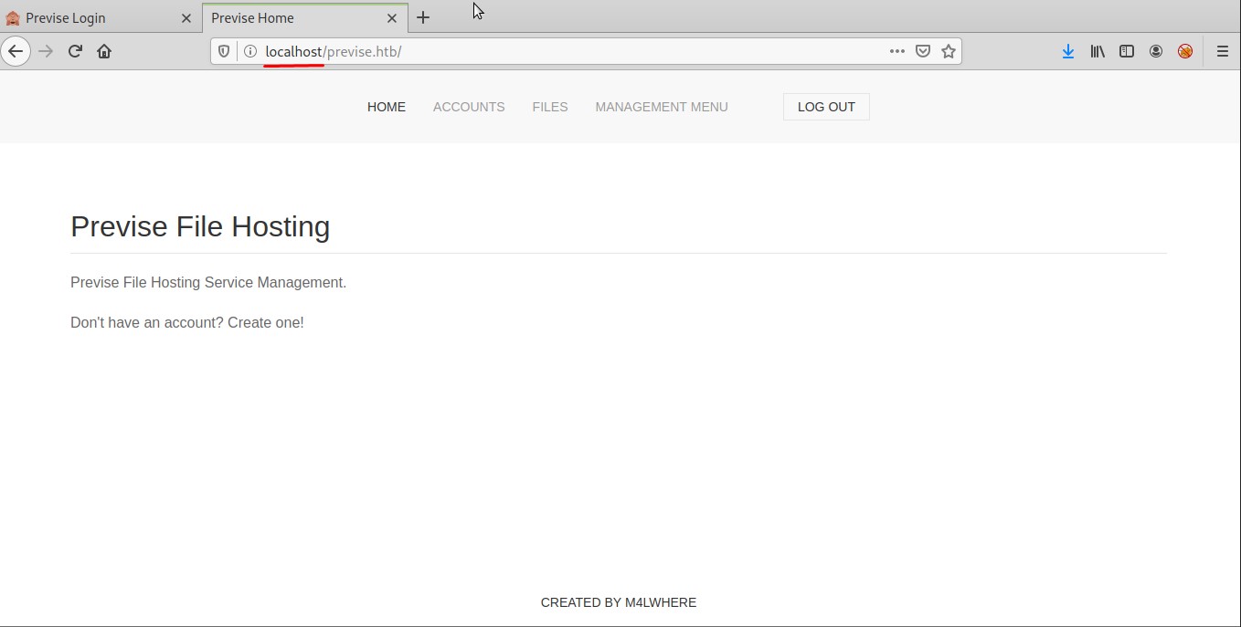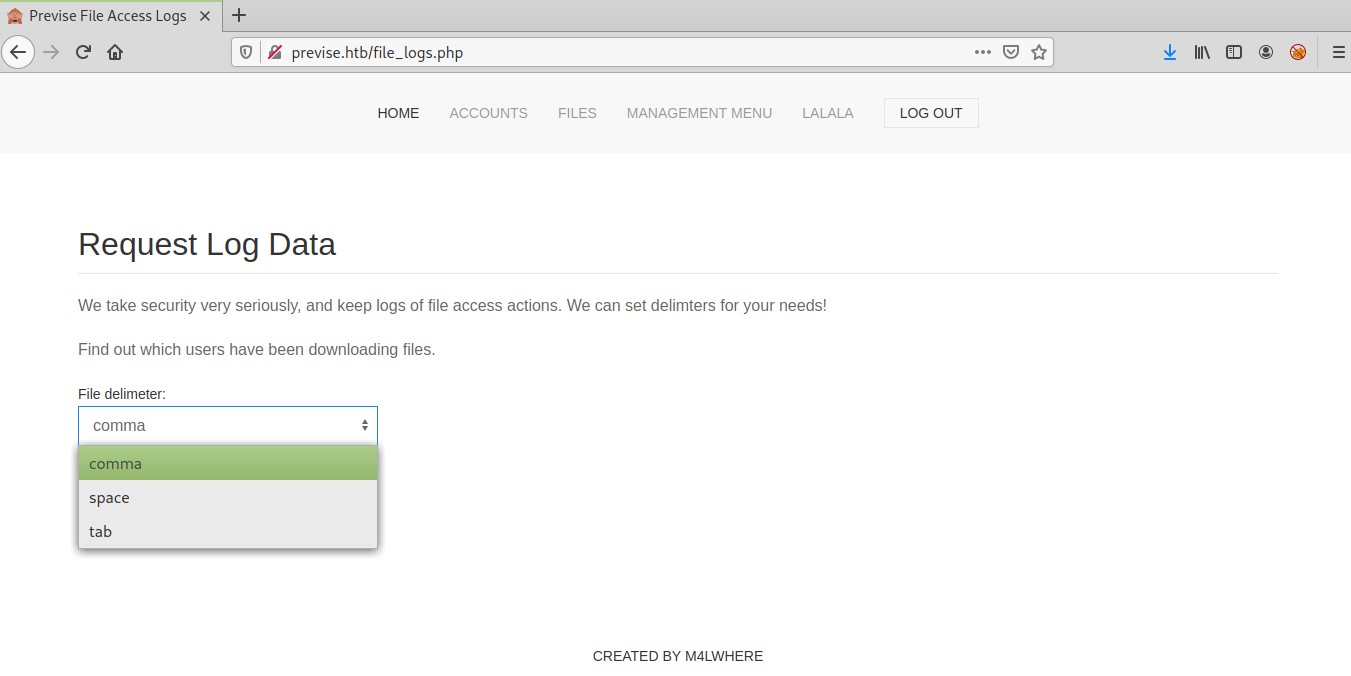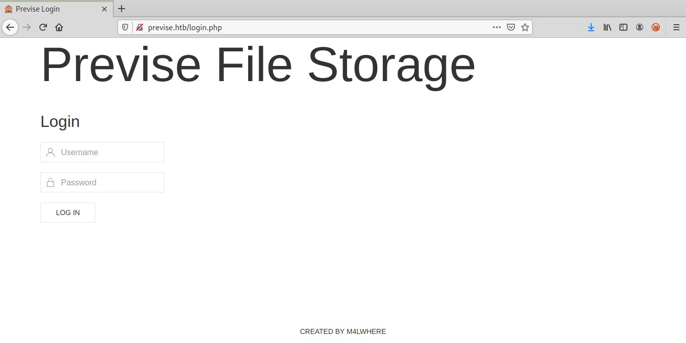 http://previse.htb/login.php [200 OK] Apache[2.4.29], Cookies[PHPSESSID], Country[RESERVED][ZZ], HTML5, HTTPServer[Ubuntu Linux][Apache/2.4.29 (Ubuntu)], IP[10.129.205.141], Meta-Author[m4lwhere], PasswordField[password], Script, Title[Previse Login]